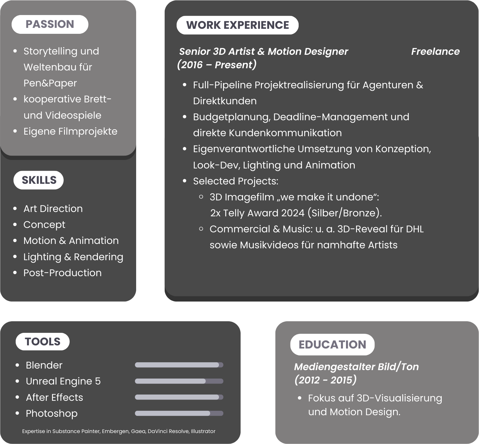 Als Senior 3D Artist und Motion Designer mit cineastischem Anspruch realisiere ich seit über 10 Jahren hochwertige 3D-Produktionen mit Fokus auf Storytelling und visuelle Wirkung.