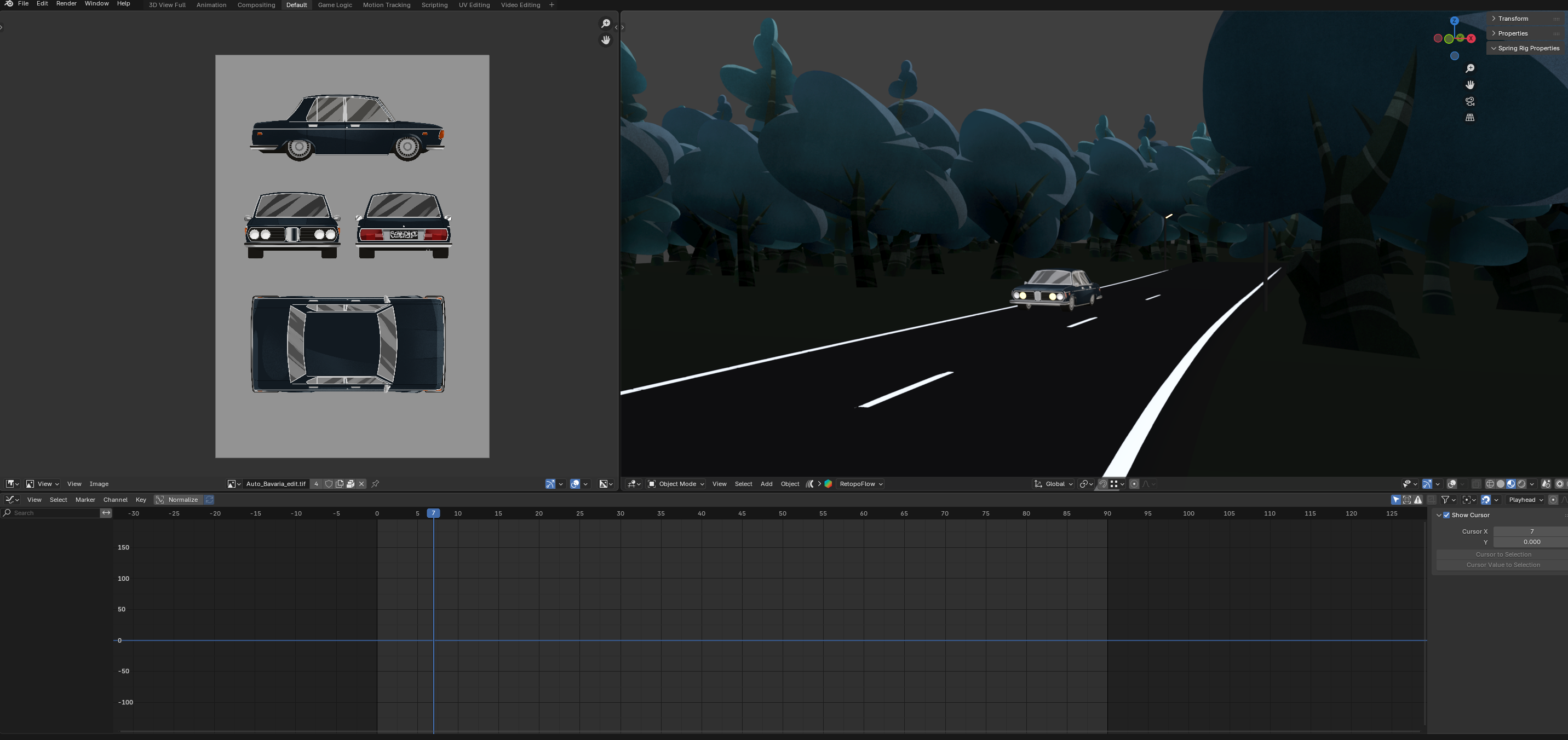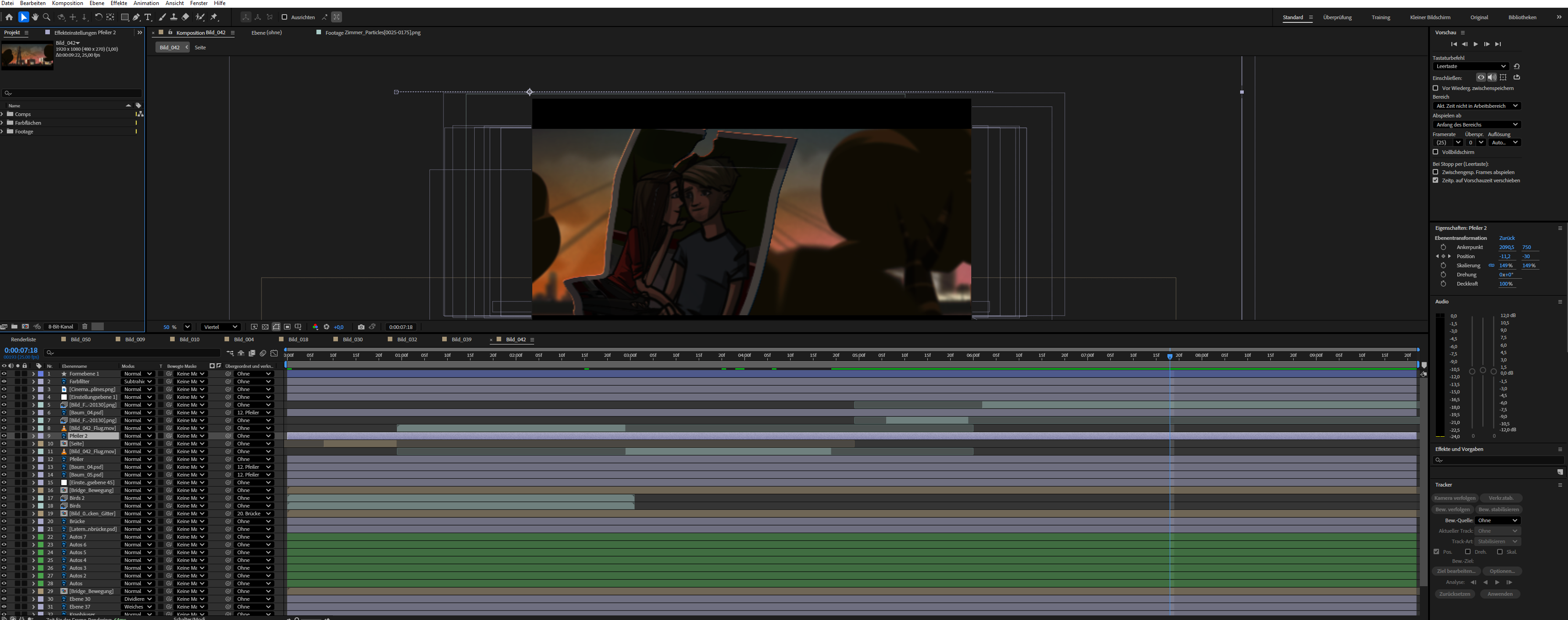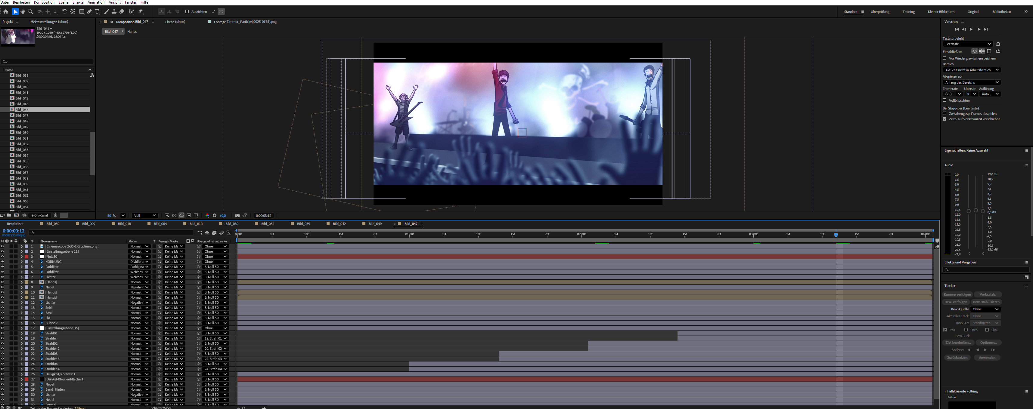 Ich übernahm anschließend die Animation der überwiegend 2D erstellten Shots, fügte vereinzelt 3D Elemente hinzu, die mit dem Zeichenstil des Grafikers harmonierten und passte anschließend mithilfe des angelieferten Songs das Pacing an.